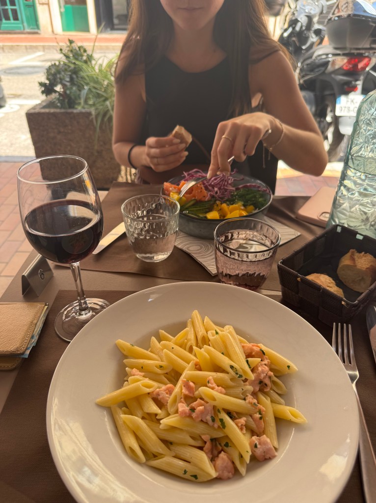 First, we went for lunch. It was extremely affordable, and the food was top-notch. The salmon/pasta was €15, and the wine was €4.